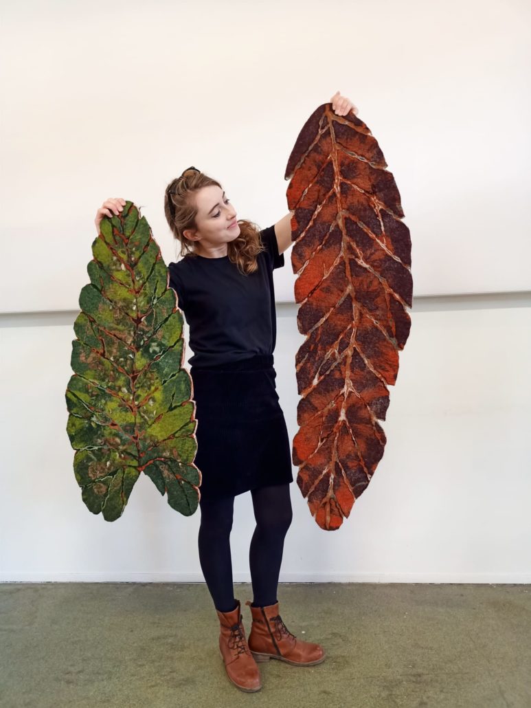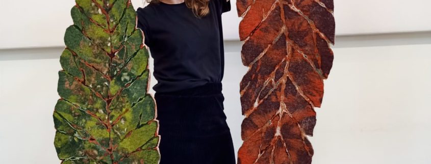 Mirjam creëert van wol bladvormige wandobjecten met de techniek natvilten. Door het bestuderen van verschillende nerfstructuren in bladeren en deze vervolgens toe te passen in de vilten wandobjecten, probeert Mirjam de diversiteit en de schoonheid van deze details over te brengen.