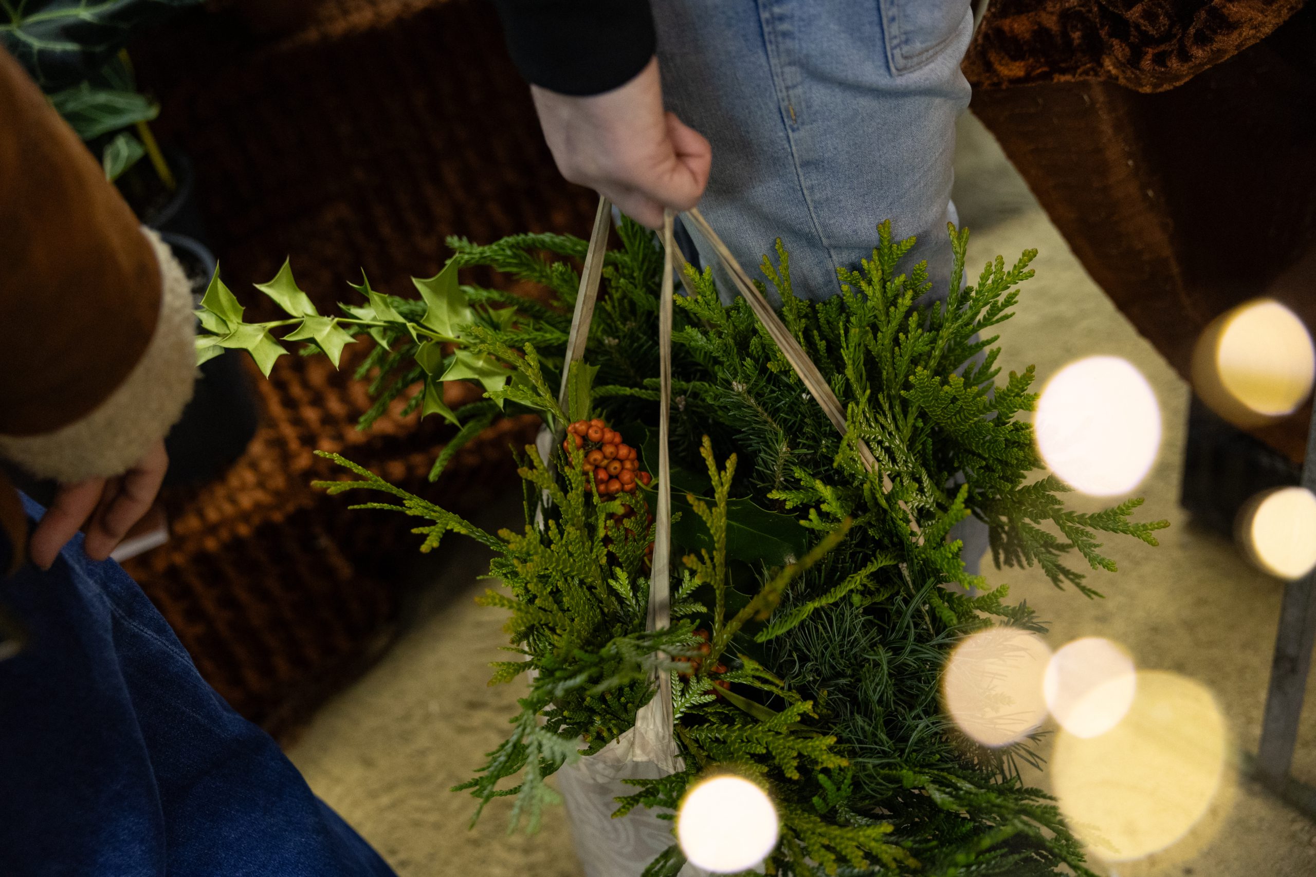 Het entreegebied wordt omgetoverd tot een sfeervol en overdekt winterplein waar je kraakvers kerstgroen koopt wat rechtstreeks uit de botanische tuin komt. Maak dit circulaire verhaal van jouw botanische kerststuk af met eco-vriendelijk steekschuim.