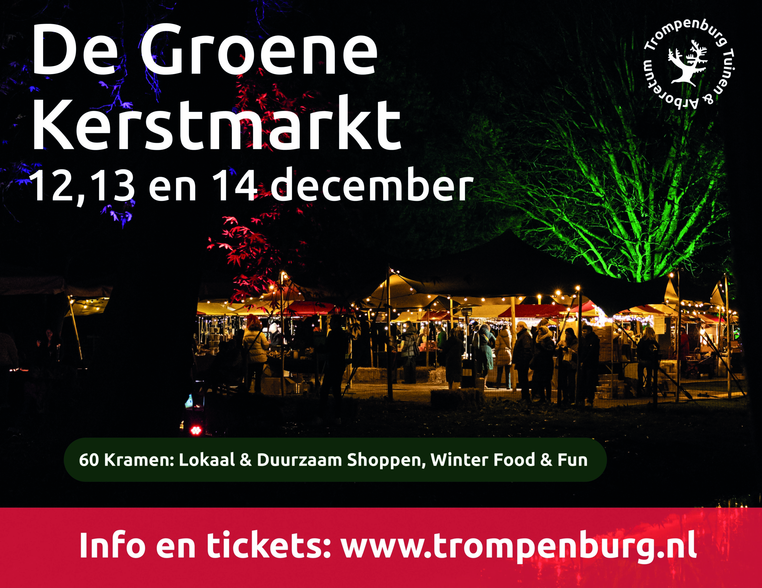 Drie dagen lang vormen de wintergroene, botanische tuinen van Trompenburg het decor voor een intieme kerstmarkt waar we jong en oud verrassen. Langs de route die je door deze historische buitenplaats leidt vind je ruim 60 kramen met producten met een link naar groen zoals helleborus, heide, biologische bloembollen en vers geknipte maretakken. Verwacht ook originele (cadeau)artikelen van lokale ondernemers. Denk aan bijzondere tuindecoratie, houtdraaiwerk, oogstproducten uit fruit en kruid, handgemaakt keramiek en warme wollen dekens en truien.