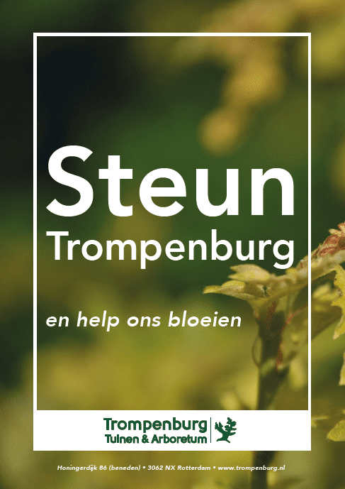 Met acht hectare is Trompenburg Tuinen & Arboretum een tuin van formaat. Trompenburg is vrijwel volledig afhankelijk van inkomsten uit entreegelden om de tuin te onderhouden.  Draag je Trompenburg een warm hart toe en wil je ons steunen? Op deze pagina vindt je verschillende mogelijkheden om een steentj aan onze botanische tuin bij te dragen. Klein of groot. Als particulier of als bedrijf.